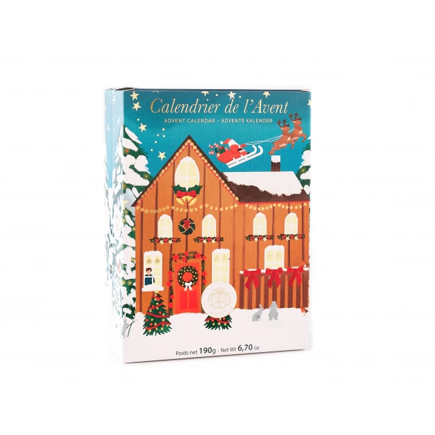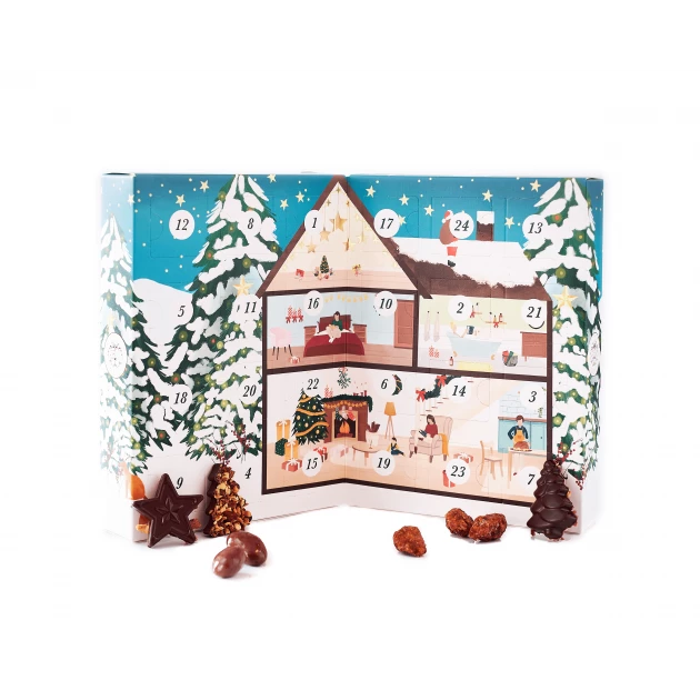 Elaboré par le Chef Hugues Pouget, ce calendrier Noël au design féérique et enneigé, abrite à l’intérieur de sa maison de poupée un assortiment de 24 douceurs sucrées pour attendre Noël.