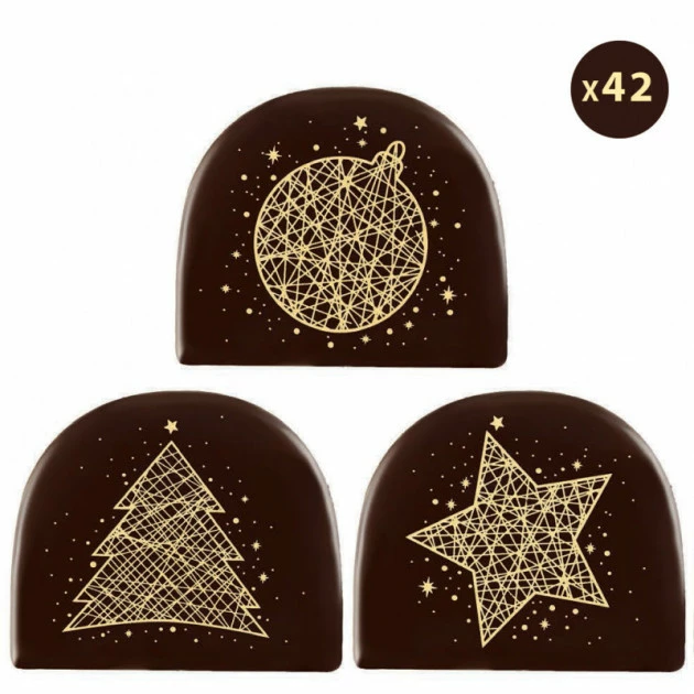 Proposés par boîte de 42 embouts de bûche, vous trouverez sur chaque décor chocolat un motif résolument festif : une boule de sapin, un sapin et une étoile de quoi enchanter vos desserts.