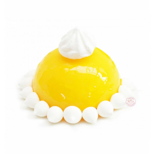 En vous référant aux informations présentes sur le pot de glaçage miroir jaune, mélangez une quantité de poudre pour glaçage miroir à de l’eau, mélangez soigneusement à l’aide d’un fouet et faites chauffer. Aidez vous d’un thermomètre afin de surveiller la température du glaçage miroir. Une fois le glaçage jaune à température, versez-le sur l’ensemble de votre entremets glacé.