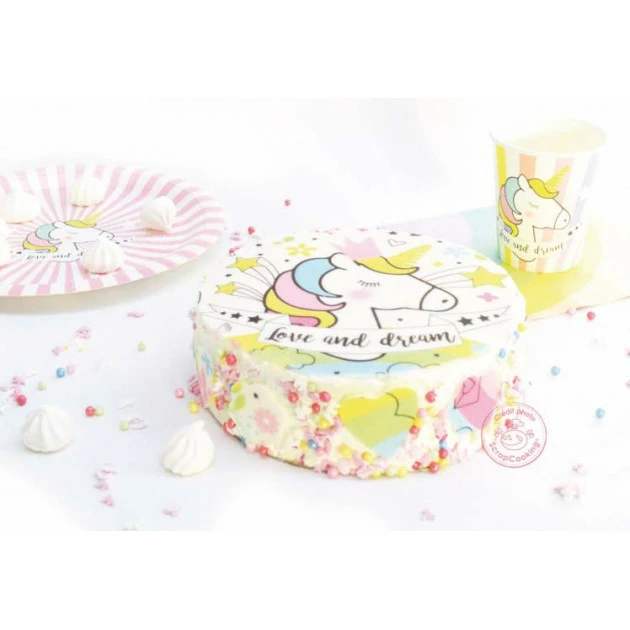 Un gâteau licorne à confectionner et peu de temps devant vous ? Nous avons la solution : la pâte à sucre imprimée licorne. Cette pâte à sucre en rouleau est prête à l’emploi; ce sont licorne, arc-en-ciel, fleurs et autres motifs colorés qui prendront place sur votre gâteau licorne.